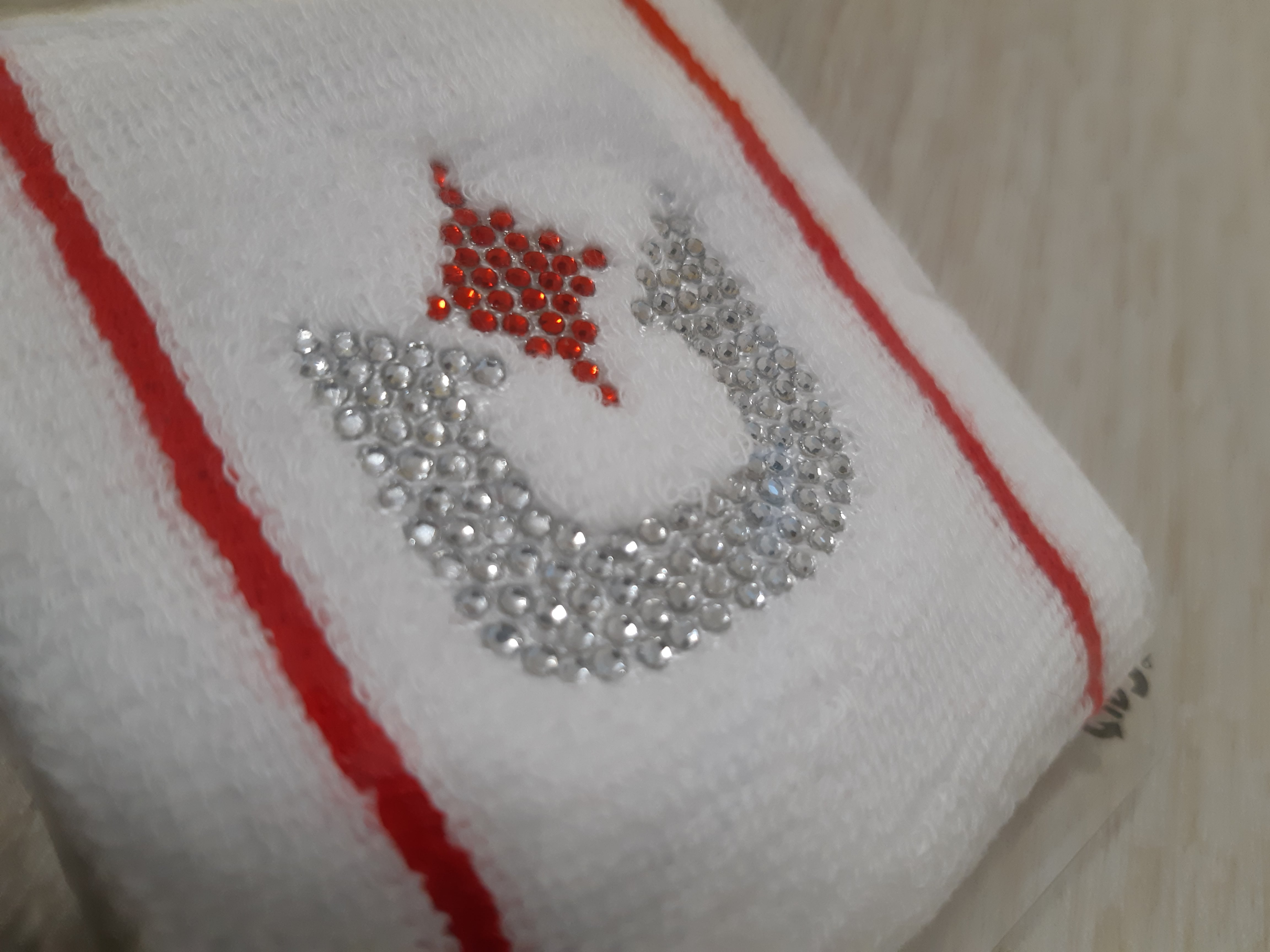 上下に赤のラインを入れ中央にこだわり抜いたシルバーラインストーン/レッドラインストーンで【D】の文字を刺繍。